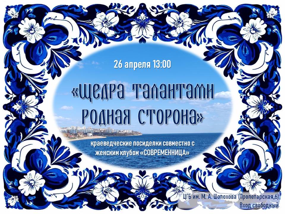 Центральная городская библиотека им. М. А. Шолохова МКУК ЦГБС приглашает на Краеведческие посиделки «Щедра талантами родная сторона» (совместно с женским клубом «Современница»)