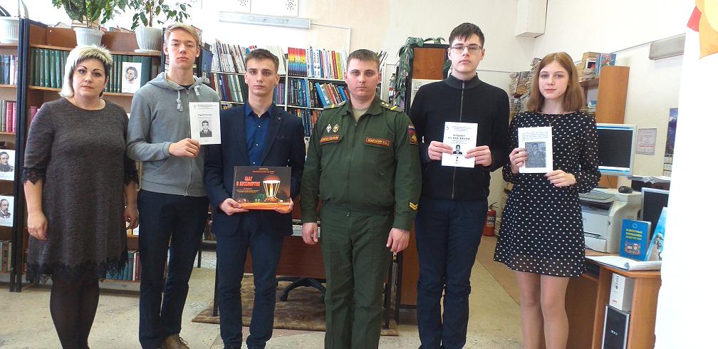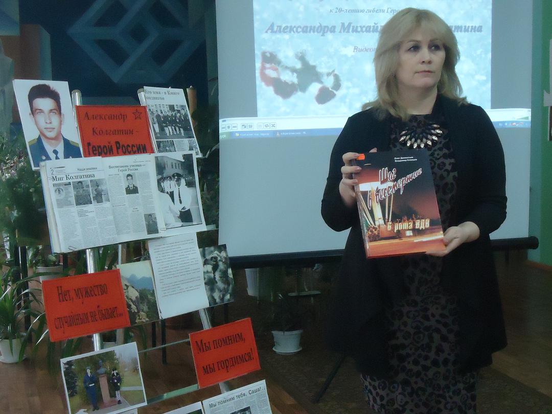 28 февраля 2020 года сотрудником библиотеки-филиала №3 МКУК ЦГБС для учащихся 2 «а» и 2 «в» классов МБОУ СШ №12 в преддверии 20 - летия памяти воинов-десантников 6-ой парашютно-десантной роты, геройски погибших в Аргунском ущелье, был проведен час героизма «Подвиг Александра Колгатина». Час героизма, проходил совместно с племянником А. М. Колгатина - инспектором военной полиции, ефрейтором – Колгатиным Евгением Сергеевичем в рамках цикла мероприятий «Гвардии герои»
