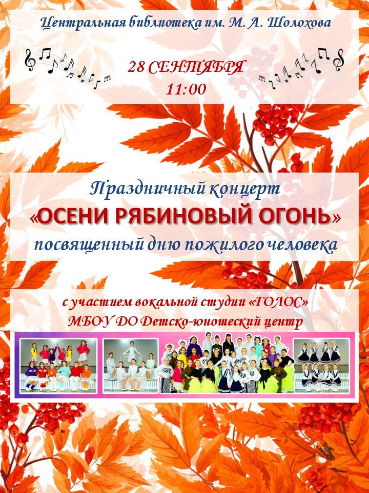 28 сентября 2025 года в камышинской Центральной городской библиотеке имени Михаила Шолохова, обновленной по нацроекту «Культура», совместно с воспитанниками вокальной студии «Голос» МБОУ ДО «Детско - юношеский центр» под руководством Сухаревой Виктории Сергеевны, состоялся праздничный вечер «Осени рябиновый огонь», в рамках празднования Дня пожилого человека.