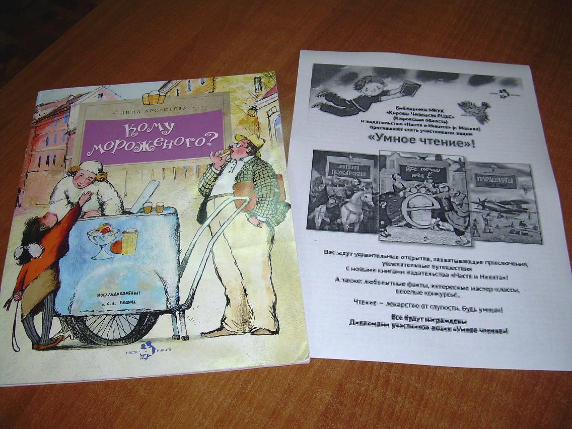 Каждая библиотека- участница акции -могла выбрать любую книгу издательства «Настя и Никита». Заведующая отделом обслуживания Камышинской ЦГДБ Ватанская Е.В.выбрала книгу Дины Арсеньевой «Кому мороженого?». На литературном десерте «Много прекрасных вещей на земле! Раз – эскимо, два – крем-брюле!» под песню Гладкова «Мороженое» Елена Вячеславовна в образе мороженщицы встречала ребят из социально-реабилитационного центра.