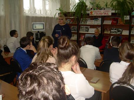 Камышинский писатель А. И. Веприцкий прочитал свой рассказ «Мы - живые!». Библиотекарь Дроздова М. М. рассказала о значении Сталинградского сражения, осветила тематику произведений автора. В ходе мероприятия тон патриотической тематике был задан видеоматериалами Российского военно-исторического общества и музыкальным видеороликом«Горячий снег Сталинграда».Алексей Иванович отвечал на все вопросы ребят, касающиеся истории Сталинградской битвы. А потом все поднялись в едином порыве на минуту молчания, ещё раз отдав дань памяти павшим и живым.