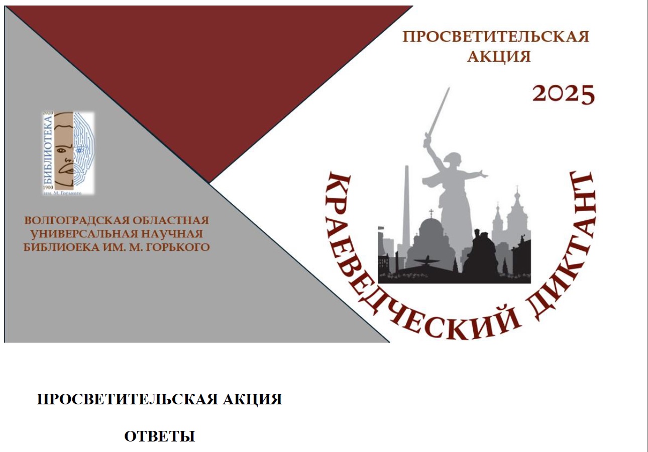 С 26 по 30 ноября 2025 года на территории Волгоградской области прошла ПРОСВЕТИТЕЛЬСКАЯ АКЦИЯ "КРАЕВЕДЧЕСКИЙ ДИКТАНТ ВОЛГОГРАДСКОЙ ОБЛАСТИ", посвященная 80-летию Победы советского народа в Великой Отечественной войне 1941–1945 гг. / Организатор - ВОУНБ им. М. Горького.