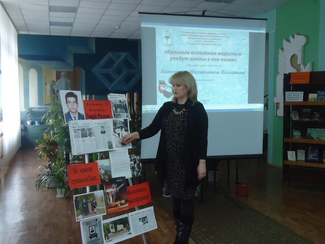 Библиотекарь с помощью   биобиблиографического очерка «Подвиг во имя жизни» ,  составленного   к 20-летию гибели А.М. Колгатина библиографом МБО МКУК ЦГБС А.И. Побединской, рассказала о юности Саши Колгатина, годах учебы в школе и в военном училище, о его заветной мечте – стать военным. Затем о службе в Пскове дивизии и о последней  командировке в Чечню.