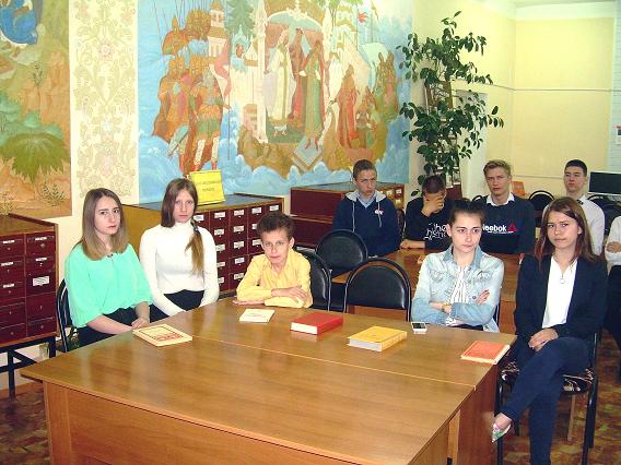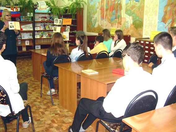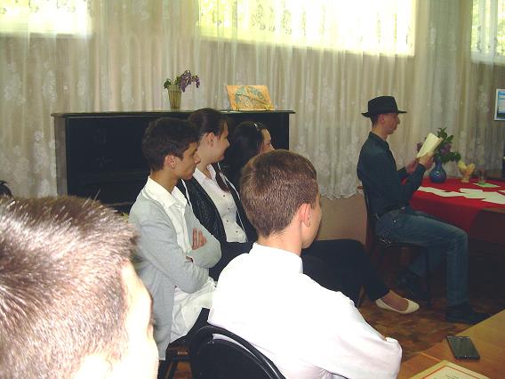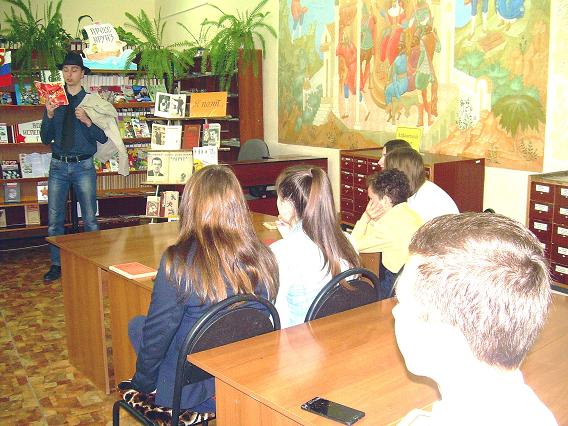 Библиотекарь Дроздова М.М. осветила основные периоды жизни и творчества поэта и рассказала о развитии и возникновении футуризма в России. Рассказ сопровождался показом фрагмента о создании манифеста футуристов из художественного фильма «Маяковский» и видеосюжетами, в которых исполнялись стихотворения В. Маяковского: «Скрипка и немного нервно» (М. Аверин) и «Лиличка» (группа «Сплин»). И, конечно же, не обошлось без присутствия самого поэта, в образе которого выступил библиотекарь Крапивин В.А. В его исполнении прозвучало стихотворение «А вы, могли бы?» и отрывок из поэмы «Хорошо». На столах перед девятиклассниками лежали томики стихотворений В. Маяковского, которые они листали, знакомясь с творчеством поэта.