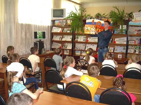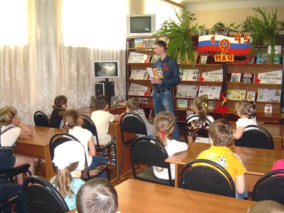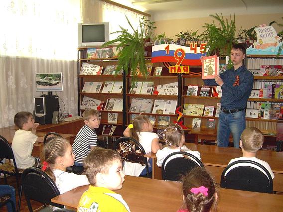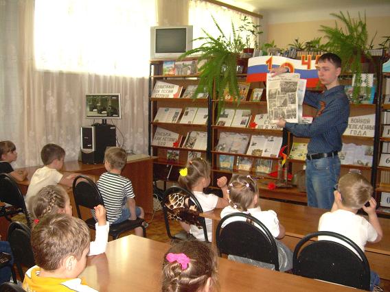 Библиотекарь младшего абонемента Крапивин В.А. рассказал ребятам,  как началась война и как тяжело было нашему народу защищаться от фашистских захватчиков.  Особое внимание ведущий уделил рассказу, как защищали нашу страну абсолютно все её жители, в том числе и дети, которые помогали всем, чем могли. В ходе этого рассказа ребятам были продемонстрированы фотографии подростков, которые заменили своих отцов  на заводах у станков. Ребята узнали о пионерах-героях, в частности о Вале Котике и Люсе Герасименко. А дополнили рассказ фрагменты из фильма "Орленок" (1957) и отрывки из рассказов  Г. Наджафова "Валя Котик" и П. Ткачёва "Люся Герасименко" из серии "Пионеры-герои". С помощью книги А. Цессарского «Операция "Мост"» и слайд - шоу ребята познакомились  с  оружием времён Великой Отечественной войны. Особый интерес у всех присутствующих вызвала  демонстрация  библиотекарем найденного при раскопках военного  снаряжения и частей оружия времен Великой Отечественной войны. Завершилось мероприятие показом видео - фрагментов парада Победы на Красной площади и обзором детских книг на военную тему.