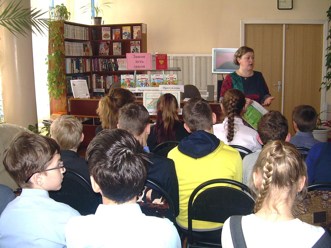 Заведующая отделом обслуживания Ватанская Е.В. напомнила ребятам об их правах, обязанностях и ответственности, познакомив с самыми главными документами по правам человека: Конституцией РФ и Конвенцией о правах ребёнка. При обзоре книг П. Астахова «Я и дорога», «Я и улица» «Я и школа» ребята активно обсуждали истории из книг и определяли, что это: проступок, правонарушение или преступление и приводили примеры из жизни. Ведущая, говоря о жизненном пути каждого человека, обратила внимание ребят на то, что каждый человек, выбирая для себя манеру поведения, общения и поступков,  иногда не замечает как шалость и проступок превращаются в преступления, и пропадает у людей радость от общения с таким человеком. И как важно, уметь жить с людьми в мире, говоря правильные слова и делая, бескорыстно, добрые дела, ведь именно они являются альтернативой всему отрицательному в душах и поступках людей. В ходе разговора были зачитаны отрывки из книги белорусского детского писателя Я. Мавра  «ТВТ»  и стихотворение А. Яшина «Спешите делать добрые дела» и ребята не только внимательно их слушали, но и активно обсуждали, ведь подросткам всегда есть чем поделиться. Не смотря на серьёзность темы, пятиклассники смогли и поиграть, дружно участвуя в литературно-правовой викторине «Имею право» и игре «Разрешается, запрещается».