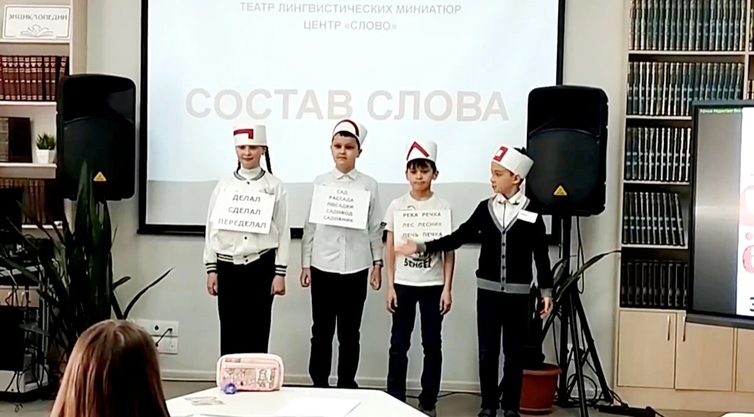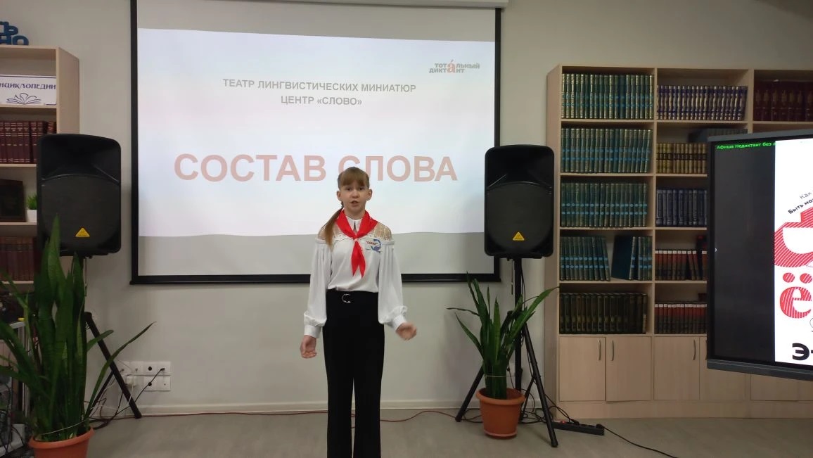 Праздничную атмосферу площадки «Недиктант.Дети» продолжило выступление театра лингвистических миниатюр Центра «Слово» с инсценировкой «Состав слова» (третьеклассники Багаева Варвара, Баланецкий Егор, Искандаров Павел, Харинин Ярослав), а Кузнецова Алёна прочла стихотворение Татьяны Гостюхиной «Слова-родственники».