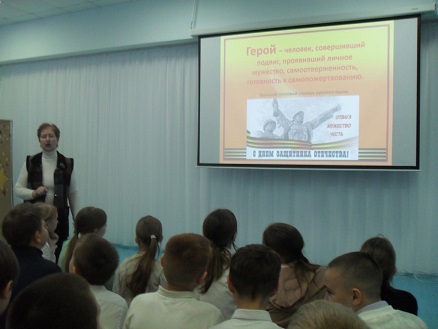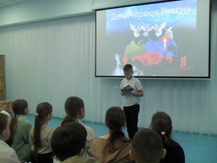 3 декабря сотрудник библиотеки-филиала № 4 МКУК ЦГБС подготовил и провёл для учащихся 5 «Б» класса МБОУ СШ № 5 литературно-музыкальную композицию «О героях слагают песни», посвящённую Дню Героев Отечества.