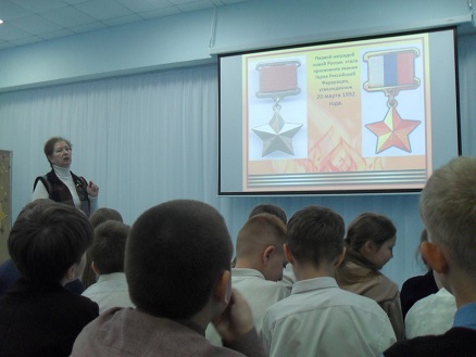 Библиотекарь, используя одноимённую презентацию, вместе с детьми совершила небольшой экскурс в историю страны ко дню основания Екатериной II ордена Святого Георгия. Она напомнила школьникам о первых полных кавалерах ордена Святого Георгия. Ведущая продолжила рассказ о женщинах – героях, которые были удостоены этой высокой награды. С интересом ребята слушали о героях Великой Отечественной войны и героях наших дней. Один из учащихся прочитал подготовленное для мероприятия стихотворение, посвящённое всем Героям Отечества. Ведущая зачитала отрывок из поэмы Роберта Рождественского «Реквием» и напомнила школьникам, что наша главная задача - помнить и чтить память о людях, которые своими самоотверженными поступками славят Отечество. Прозвучала песня «Я - русский» в исполнении известного российского певца Ярослава Дронова (Шаман).