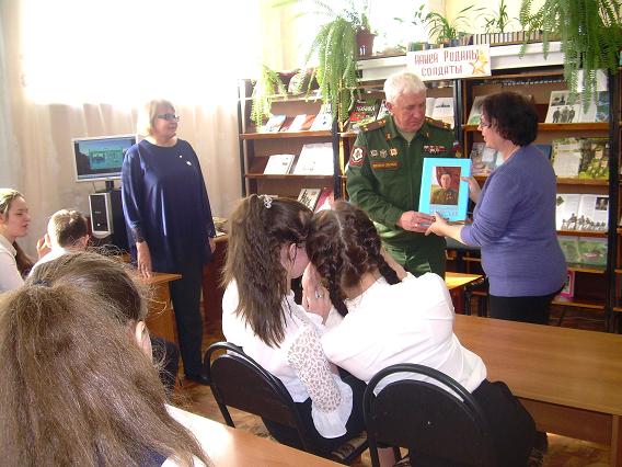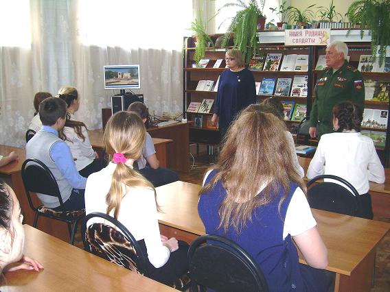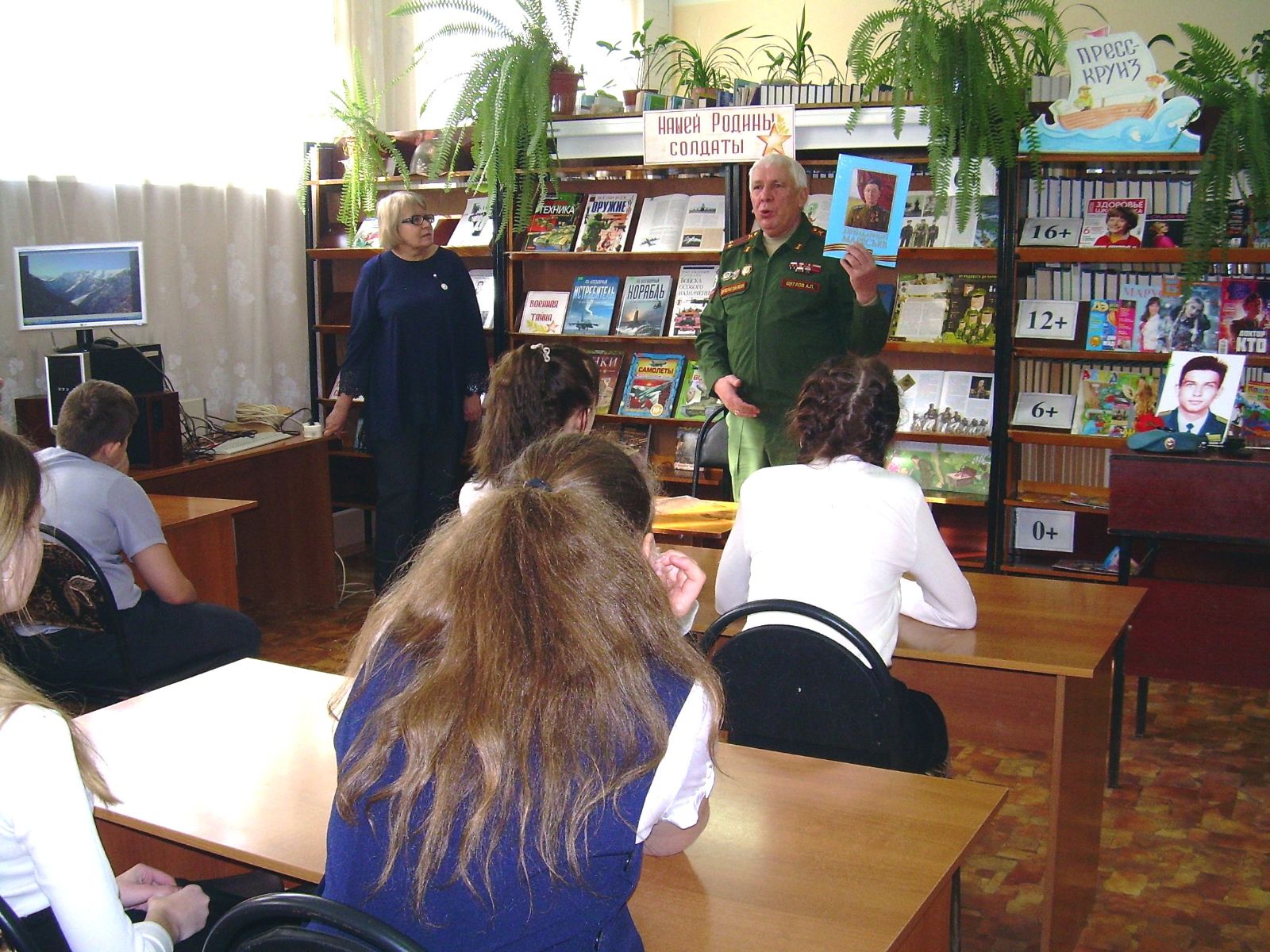 Патриотический настрой мероприятию был задан демонстрацией видеоролика «Памяти 6-й роты». Библиотекарь Дроздова М.М. напомнила ребятам, что текущий год 75-летия Победы– значимый год для всей России  и привела строки из выступления Президента России В.В. Путина о преемственности поколений и настоящих героях, с которых надо брать пример – десантниках 6-й роты. Александр Петрович рассказал о своей службе в рядах российской армии в период 1-го этапа военно-чеченского конфликта, о становлении воинского характера и  о подвиге Александра Колгатина, с которым его сын  вместе учился   в Камышинском военном училище . Ребята с интересом смотрели военные фотографии, сделанные А.П. Щегловым в Чечне,  и рассуждали о мужестве и героизме российских воинов. В конце встречи ведущая познакомила присутствующих с краеведческими материалами периодических изданий , посвящённых Александру Колгатину.