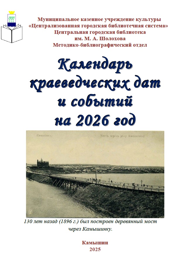 Календарь краеведческих дат и событий на 2026 год / МКУК ЦГБС, ЦГБ им. М. А. Шолохова, методико-библиографический отдел ; [сост. А. И. Побединская ; ред. Р. А. Зуева ; отв. за вып. Е. К. Голова]. - Камышин, 2025. – 32 с.