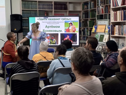 В этот осенний день уютный зал модельной библиотеки быстро заполнился любителями театра, все собрались на встречу с актёром Камышинского драматического театра Артёмом Викторовичем Буняковым и его коллегами. Настоящим праздником для всех участников встречи стали выступления артистов. В самом начале встречи был показан фрагмент из спектакля «Возвращение Белкина» (эпизод из повести А.С. Пушкина «Метель»). В роли полковника Бурмина - Артём Буняков, в роли Марьи Гавриловны – Мария Клыпина. Маленький эпизод из премьерной постановки нового сезона «Возвращение Белкина» очень тронул сердца зрителей.
