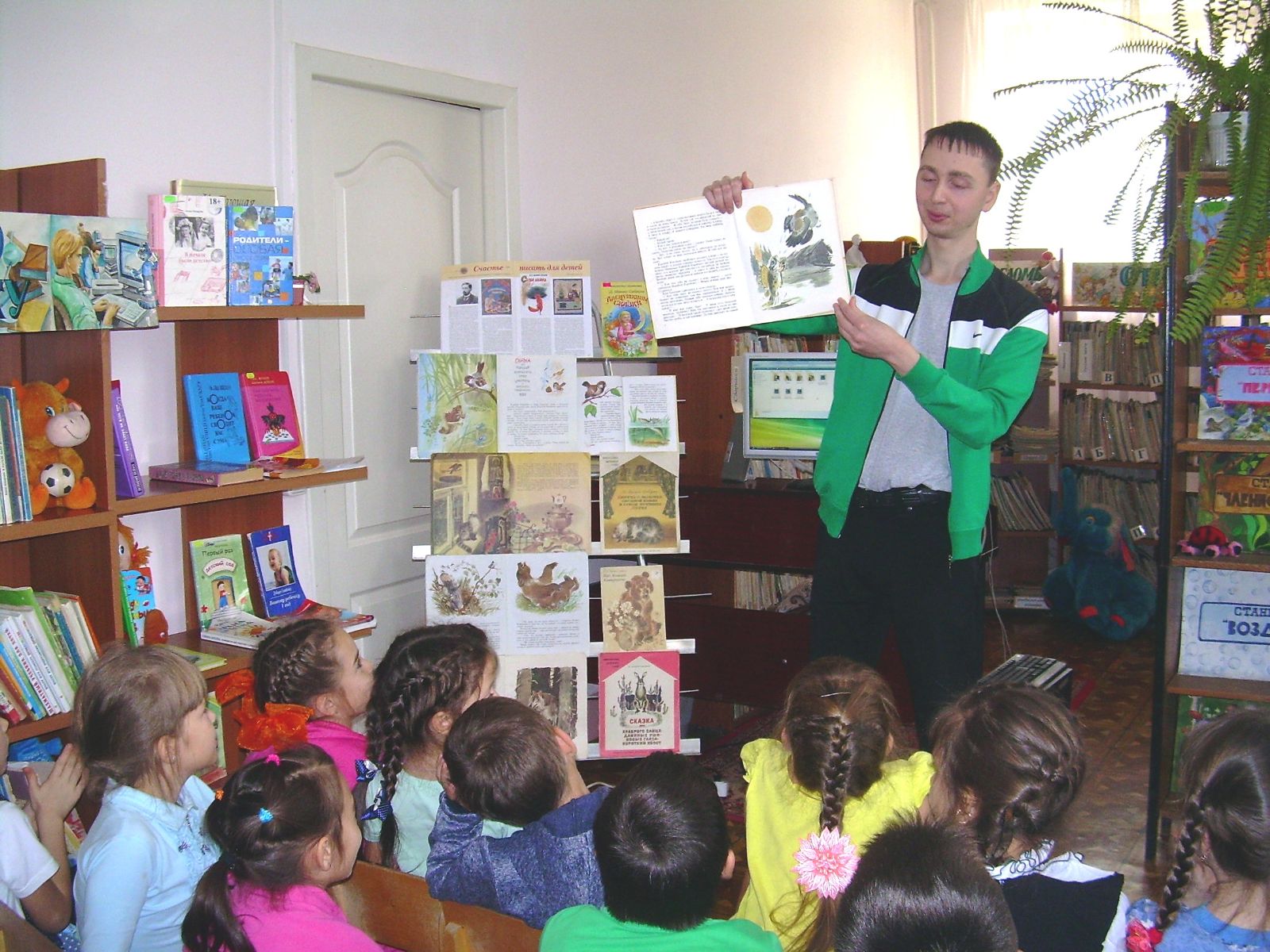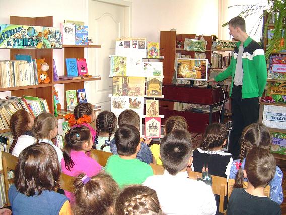 По ходу чтения сказки часто звучали слова «ёрш» и «воробей» и в этот момент двое ребят- помощников из этой же аудитории, поднимали фигурки воробья и ерша вверх и показывали действия этих литературных героев. Во время чтения библиотекарь задавал ребятам наводящие вопросы или просил прокомментировать какие-нибудь отрывки сказки. После прочтения сказки библиотекарь показал иллюстрации разных художников к этому произведени ю, с помощью слайд-шоу продемонстрировал многообразие видов воробьев и рыб, а ребята порассуждали о смысле сказки, её идее и о том, какой урок можно из неё извлечь.