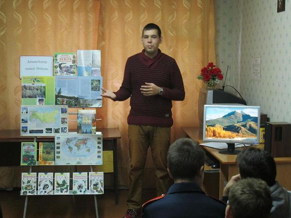 Вместе с библиотекарем Каштановым Д. А. ребята отправились в путешествие по заповедникам России, представленным на книжных страницах и слайдах электронной презентации. Но сначала учащимся пришлось разобраться в терминологии, изучив по материалам книжной выставки, чем отличаются заповедники, заказники и национальные парки друг от друга. Далее ребята подробно рассмотрели климатические условия, флору и фауну Баргузинского, Арктического, Алтайского заповедников, а также заповедников «Кивач» и «Остров Врангеля». С интересом ребята узнали, как выглядят изюбрь, солонгой, нерпа и омуль, посмотрев видео-экскурсию по Баргузинскому заповеднику. Некоторые охраняемые представители фауны нашей страны были незнакомы детям, пробелы в этих знаниях ребята пообещали заполнить, посетив библиотеку в свободное время.