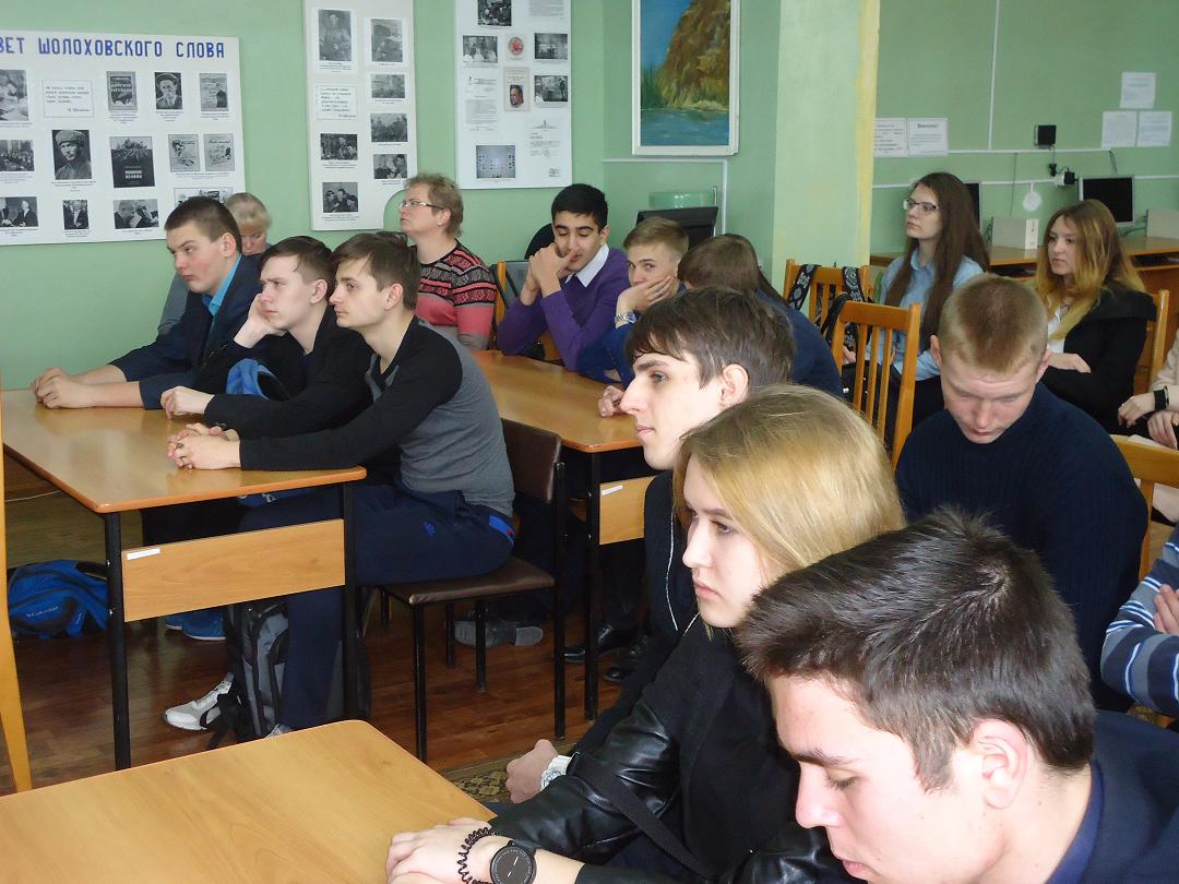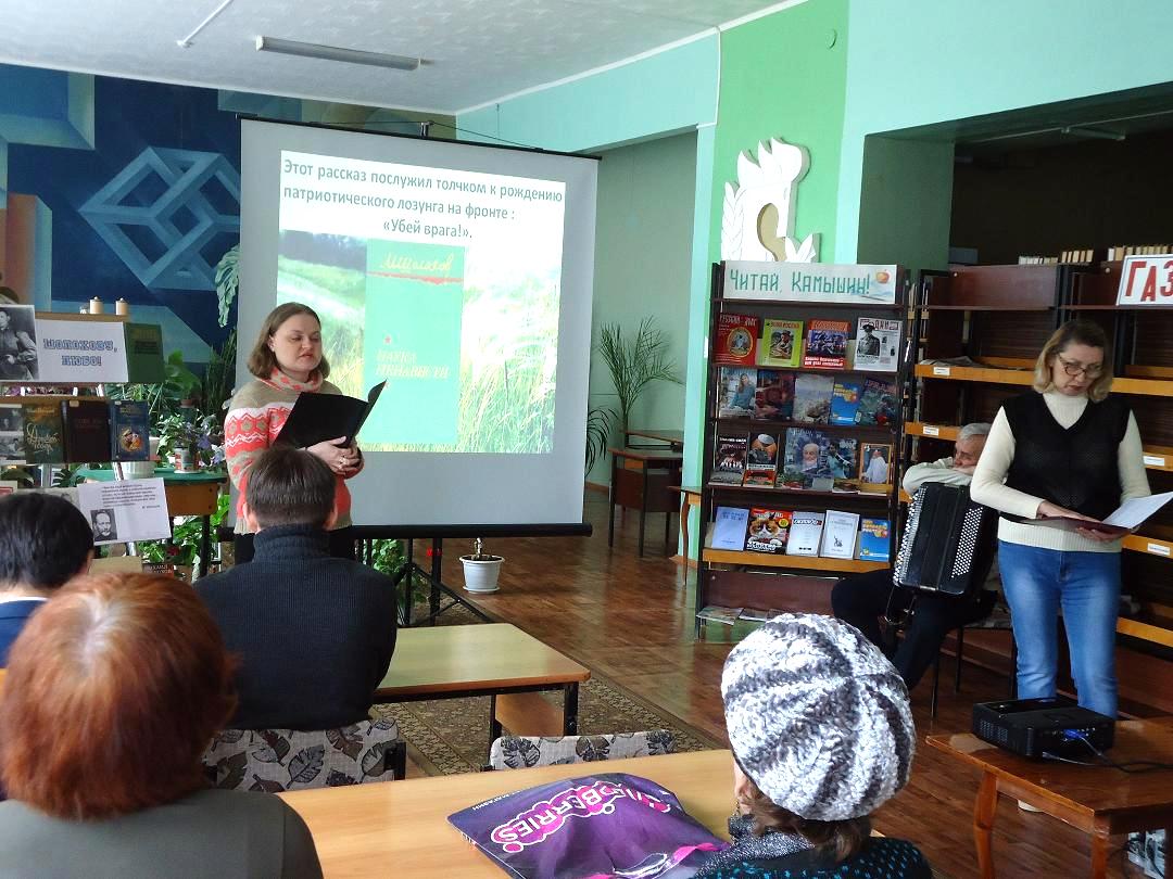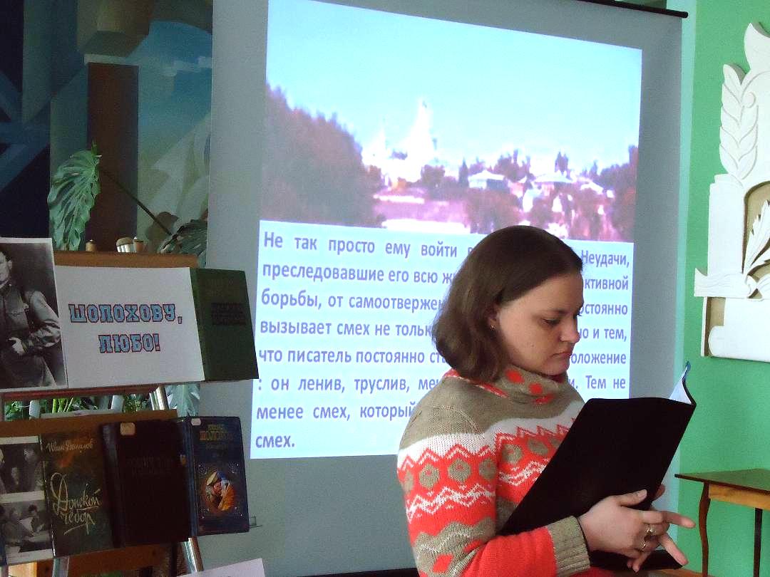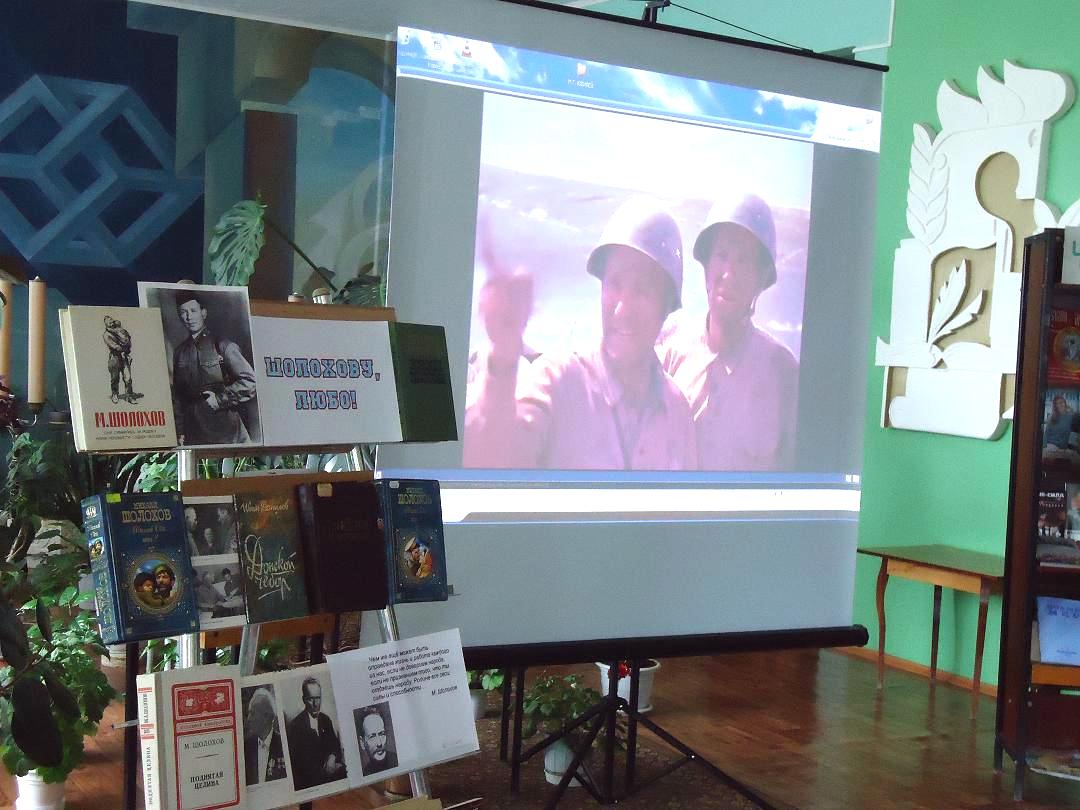 Библиотекари Менькина Татьяна Юльевна  и Гревцова Светлана Михайловна     познакомила  с  жизнью и творчеством  М.А. Шолохова. Рассказ сопровождался  электронной презентацией «Гений русской литературы XX века», разработанной МБО ЦГБ.. Во время Великой Отечественной войны писатель неоднократно бывал в г.Камышине, , здесь написал «Науку ненависти», здесь работал над главами романа «Они сражались за Родину».Ккадры из одноименного  художественного фильма были продемонстрированы для участников мероприятия. А известный камышинский журналист В.Н. Мамонтов издал книгу «Свет тех встреч» - воспоминания тех, кому довелось встречаться с Шолоховым в военной обстановке. Эта и многие другие книги были представлены на тематической  книжной выставке.