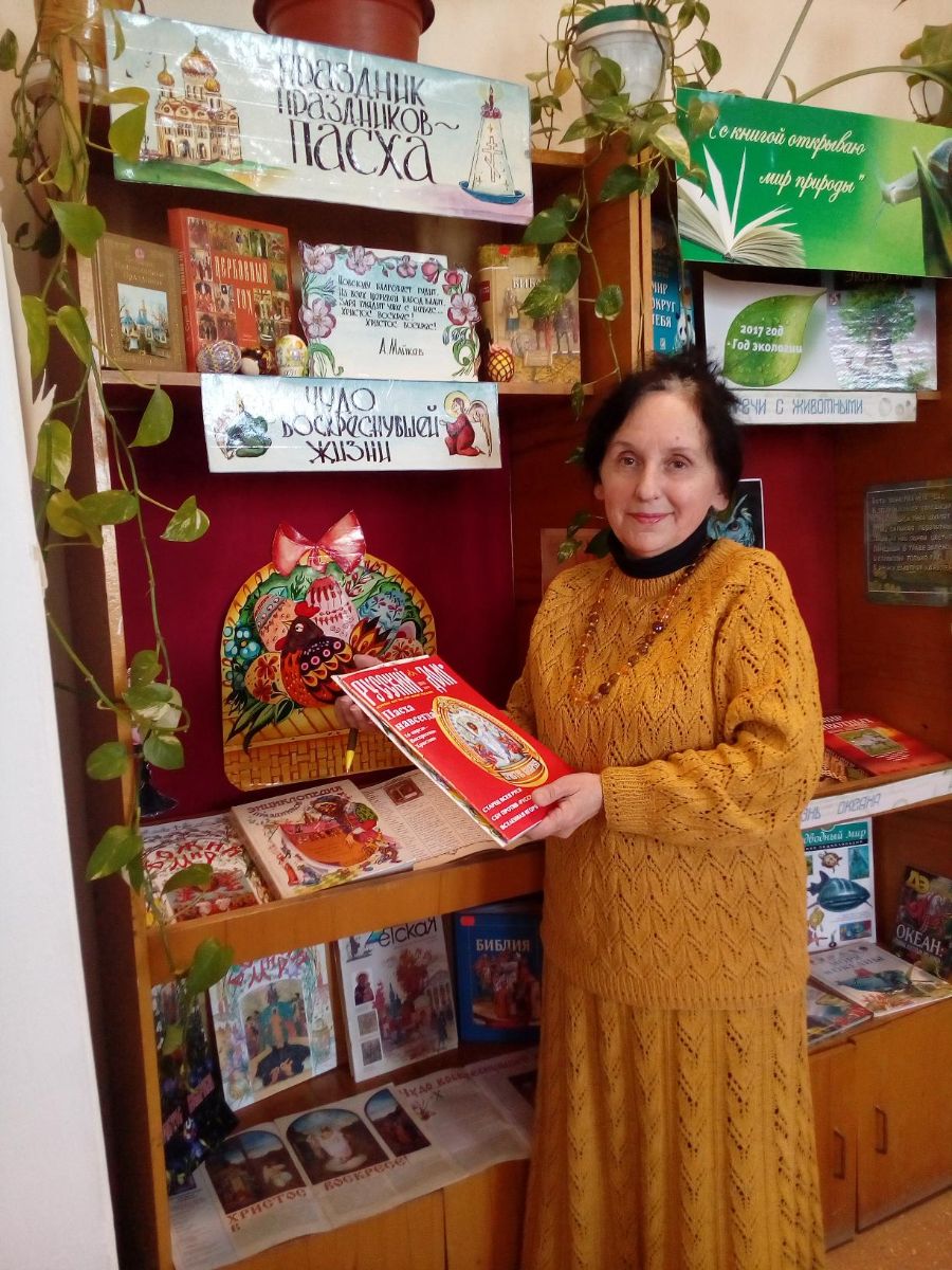Библиотекарь читального зала Асеева В. П. представила книги и журналы о Великой Пасхе.