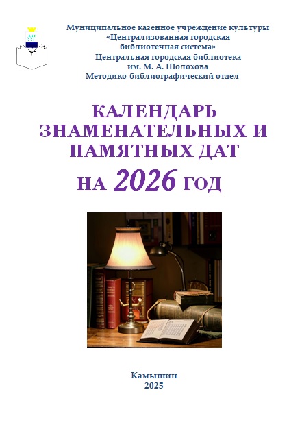 «Календарь знаменательных и памятных дат на 2026 год» / Муниципальное казенное учреждение культуры "Централизованная городская библиотечная система", Центральная городская библиотека им. М. А. Шолохова, методико-библиографический отдел ; сост. Р. А Зуева ; ред. Е. Н. Рагузина ; отв. за вып. Е. К. Голова. - Камышин, 2025. – 84 с. : ил.