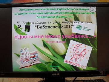 21 апреля 2017 года в библиотека – филиал № 4 ,в члены клуба «Надежда», ТОС « Улыбка» и самые активные читатели традиционно присоединились к VI Всероссийской акции в поддержку чтения . БиблиоНочь – 2017года называлась « Незабудки» по одноименной книги М.Пришвина и была посвящена Году экологии России.